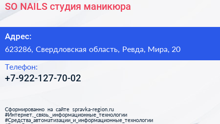 SO NAILS, студия маникюра по адресу 623286, Свердловская область, Ревда, Мира, 20 в дальнейшем Организация, размещена в следующих категориях: