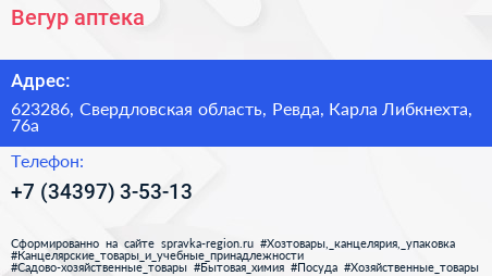 Вегур, аптека по адресу 623286, Свердловская область, Ревда, Карла Либкнехта, 76а в дальнейшем Организация, размещена в следующих категориях: