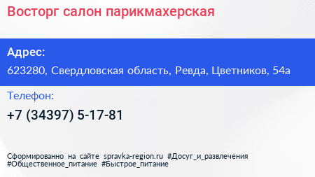 Восторг, салон-парикмахерская по адресу 623280, Свердловская область, Ревда, Цветников, 54а в дальнейшем Организация, размещена в следующих категориях: