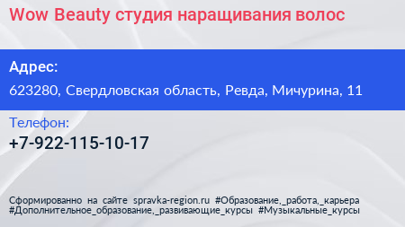 Wow Beauty, студия наращивания волос по адресу 623280, Свердловская область, Ревда, Мичурина, 11 в дальнейшем Организация, размещена в следующих категориях: