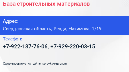 База строительных материалов по адресу Свердловская область, Ревда, Нахимова, 1/19 в дальнейшем Организация, размещена в следующих категориях: