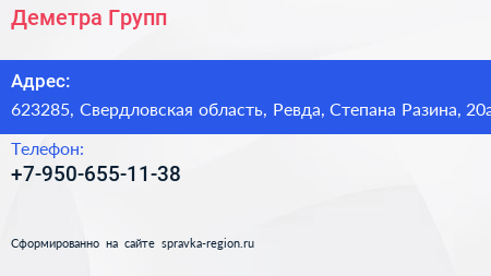 Деметра Групп по адресу 623285, Свердловская область, Ревда, Степана Разина, 20а в дальнейшем Организация, размещена в следующих категориях: