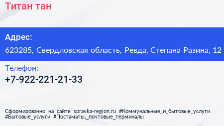 Титан тан по адресу 623285, Свердловская область, Ревда, Степана Разина, 12 в дальнейшем Организация, размещена в следующих категориях: