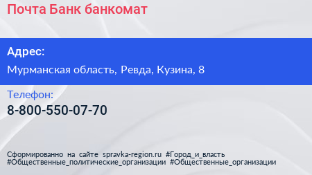 Почта Банк, банкомат по адресу Мурманская область, Ревда, Кузина, 8 в дальнейшем Организация, размещена в следующих категориях: