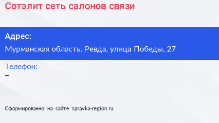 Сотэлит, сеть салонов связи по адресу Мурманская область, Ревда, улица Победы, 27 в дальнейшем Организация, размещена в следующих категориях: