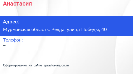 Анастасия по адресу Мурманская область, Ревда, улица Победы, 40 в дальнейшем Организация, размещена в следующих категориях: