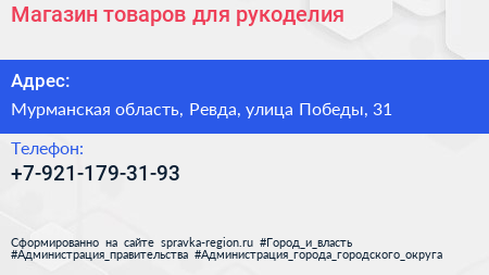 Магазин товаров для рукоделия по адресу Мурманская область, Ревда, улица Победы, 31 в дальнейшем Организация, размещена в следующих категориях: