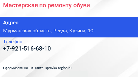 Мастерская по ремонту обуви по адресу Мурманская область, Ревда, Кузина, 10 в дальнейшем Организация, размещена в следующих категориях: