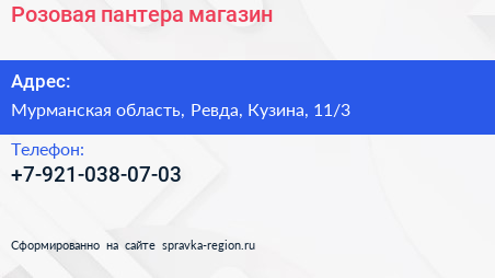 Розовая пантера, магазин по адресу Мурманская область, Ревда, Кузина, 11/3 в дальнейшем Организация, размещена в следующих категориях: