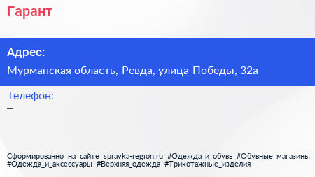 Гарант по адресу Мурманская область, Ревда, улица Победы, 32а в дальнейшем Организация, размещена в следующих категориях: