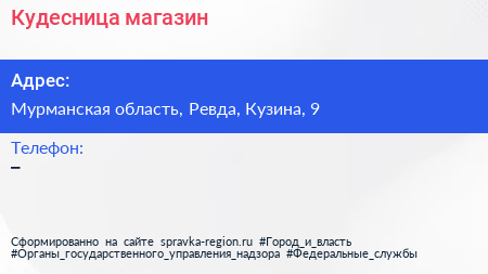 Кудесница, магазин по адресу Мурманская область, Ревда, Кузина, 9 в дальнейшем Организация, размещена в следующих категориях: