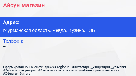 Айсун, магазин по адресу Мурманская область, Ревда, Кузина, 13Б в дальнейшем Организация, размещена в следующих категориях: