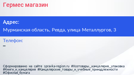 Гермес, магазин по адресу Мурманская область, Ревда, улица Металлургов, 3 в дальнейшем Организация, размещена в следующих категориях: