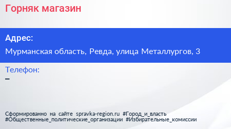 Горняк, магазин по адресу Мурманская область, Ревда, улица Металлургов, 3 в дальнейшем Организация, размещена в следующих категориях: