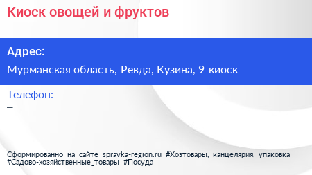 Киоск овощей и фруктов по адресу Мурманская область, Ревда, Кузина, 9 киоск в дальнейшем Организация, размещена в следующих категориях: