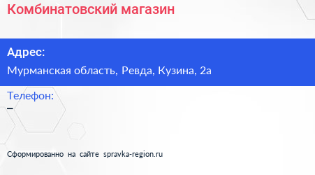 Комбинатовский, магазин по адресу Мурманская область, Ревда, Кузина, 2а в дальнейшем Организация, размещена в следующих категориях: