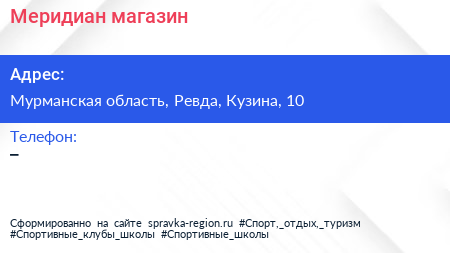 Меридиан, магазин по адресу Мурманская область, Ревда, Кузина, 10 в дальнейшем Организация, размещена в следующих категориях: