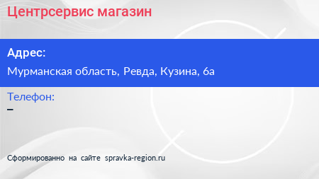 Центрсервис, магазин по адресу Мурманская область, Ревда, Кузина, 6а в дальнейшем Организация, размещена в следующих категориях: