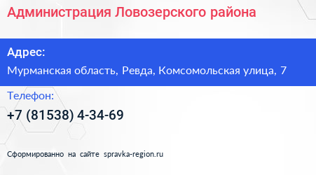 Администрация Ловозерского района по адресу Мурманская область, Ревда, Комсомольская улица, 7 в дальнейшем Организация, размещена в следующих категориях: