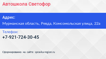 Автошкола Светофор по адресу Мурманская область, Ревда, Комсомольская улица, 22а в дальнейшем Организация, размещена в следующих категориях:
