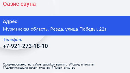 Оазис, сауна по адресу Мурманская область, Ревда, улица Победы, 22а в дальнейшем Организация, размещена в следующих категориях:
