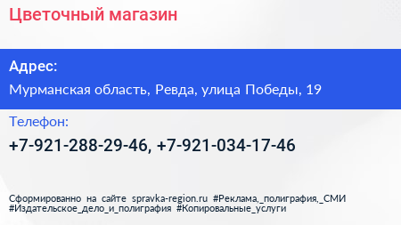 Цветочный магазин по адресу Мурманская область, Ревда, улица Победы, 19 в дальнейшем Организация, размещена в следующих категориях: