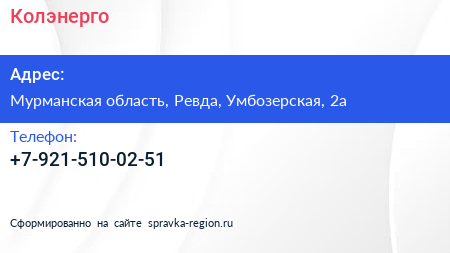 Колэнерго по адресу Мурманская область, Ревда, Умбозерская, 2а в дальнейшем Организация, размещена в следующих категориях: