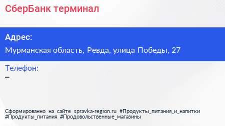 СберБанк, терминал по адресу Мурманская область, Ревда, улица Победы, 27 в дальнейшем Организация, размещена в следующих категориях: