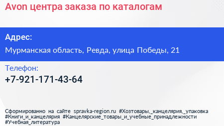 Avon, центра заказа по каталогам по адресу Мурманская область, Ревда, улица Победы, 21 в дальнейшем Организация, размещена в следующих категориях: