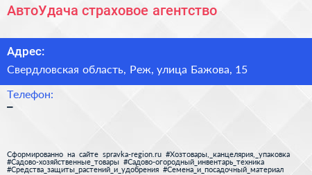 АвтоУдача, страховое агентство по адресу Свердловская область, Реж, улица Бажова, 15 в дальнейшем Организация, размещена в следующих категориях: