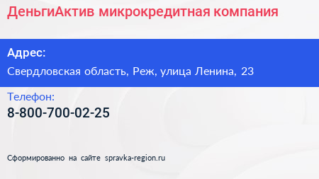 ДеньгиАктив, микрокредитная компания по адресу Свердловская область, Реж, улица Ленина, 23 в дальнейшем Организация, размещена в следующих категориях:
