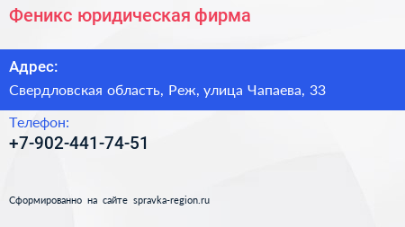 Феникс, юридическая фирма по адресу Свердловская область, Реж, улица Чапаева, 33 в дальнейшем Организация, размещена в следующих категориях:
