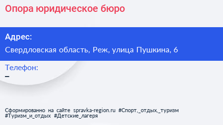 Опора, юридическое бюро по адресу Свердловская область, Реж, улица Пушкина, 6 в дальнейшем Организация, размещена в следующих категориях: