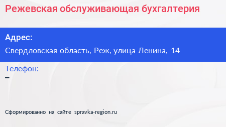 Режевская обслуживающая бухгалтерия по адресу Свердловская область, Реж, улица Ленина, 14 в дальнейшем Организация, размещена в следующих категориях: