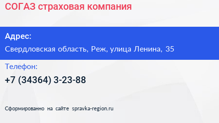 СОГАЗ, страховая компания по адресу Свердловская область, Реж, улица Ленина, 35 в дальнейшем Организация, размещена в следующих категориях: