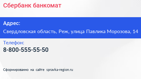 Сбербанк, банкомат по адресу Свердловская область, Реж, улица Павлика Морозова, 14 в дальнейшем Организация, размещена в следующих категориях: