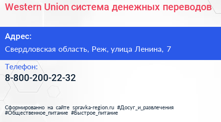 Western Union, система денежных переводов по адресу Свердловская область, Реж, улица Ленина, 7 в дальнейшем Организация, размещена в следующих категориях: