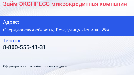 Займ ЭКСПРЕСС, микрокредитная компания по адресу Свердловская область, Реж, улица Ленина, 29а в дальнейшем Организация, размещена в следующих категориях: