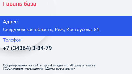 Гавань, база по адресу Свердловская область, Реж, Костоусова, 81 в дальнейшем Организация, размещена в следующих категориях: