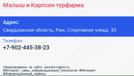 Малыш и Карлсон, турфирма по адресу Свердловская область, Реж, Спортивная улица, 10 в дальнейшем Организация, размещена в следующих категориях:
