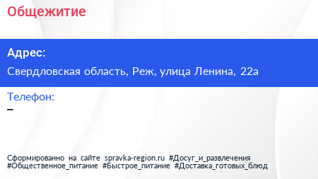 Общежитие по адресу Свердловская область, Реж, улица Ленина, 22а в дальнейшем Организация, размещена в следующих категориях: