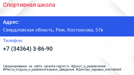 Спортивная школа по адресу Свердловская область, Реж, Костоусова, 57в в дальнейшем Организация, размещена в следующих категориях: