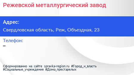 Режевской металлургический завод по адресу Свердловская область, Реж, Объездная, 23 в дальнейшем Организация, размещена в следующих категориях: