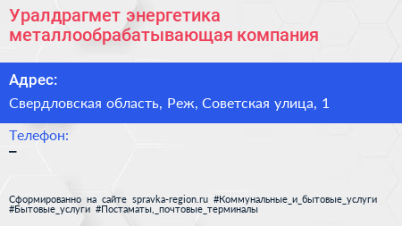 Уралдрагмет-энергетика, металлообрабатывающая компания по адресу Свердловская область, Реж, Советская улица, 1 в дальнейшем Организация, размещена в следующих категориях: