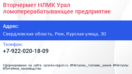Вторчермет НЛМК Урал, ломоперерабатывающее предприятие по адресу Свердловская область, Реж, Курская улица, 30 в дальнейшем Организация, размещена в следующих категориях:
