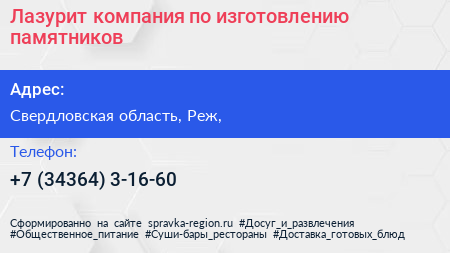 Лазурит, компания по изготовлению памятников по адресу Свердловская область, Реж, в дальнейшем Организация, размещена в следующих категориях:
