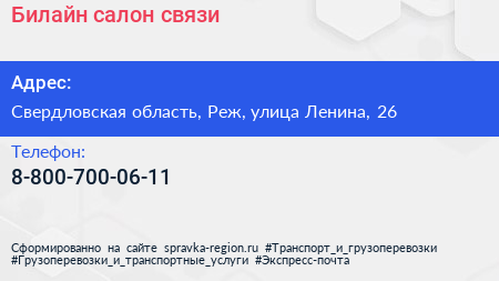 Билайн, салон связи по адресу Свердловская область, Реж, улица Ленина, 26 в дальнейшем Организация, размещена в следующих категориях: