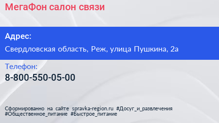 МегаФон, салон связи по адресу Свердловская область, Реж, улица Пушкина, 2а в дальнейшем Организация, размещена в следующих категориях: