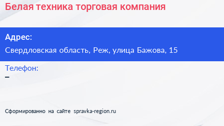 Белая техника, торговая компания по адресу Свердловская область, Реж, улица Бажова, 15 в дальнейшем Организация, размещена в следующих категориях: