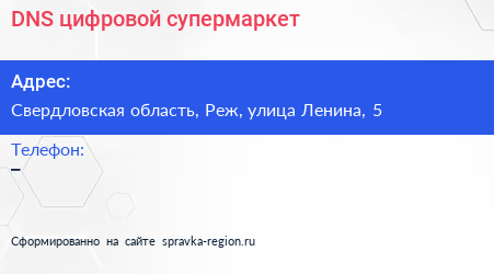 DNS, цифровой супермаркет по адресу Свердловская область, Реж, улица Ленина, 5 в дальнейшем Организация, размещена в следующих категориях: